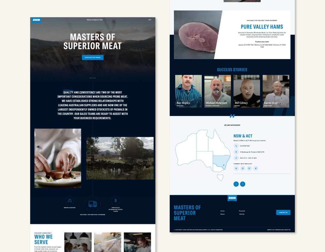 The site was built with both functionality and perception in mind: robust enough to serve as a practical tool for business clients, yet refined enough to enhance AWM’s brand authority within the meat industry.